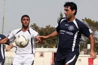 עיסא ערכאן(בלבן)ואמיר סבן מנסים להגיע לכדור בדרך מיוחדת.(צילום:לירן דורף)