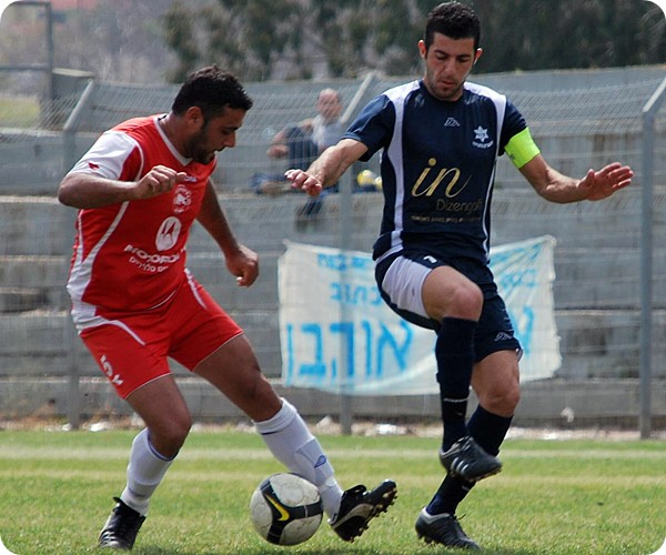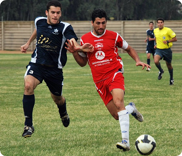 אמיתי שרון(באדום)וקובי בדש מהשרון במפגש רגליים.(צילום:אמיר דבי)
