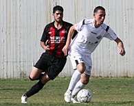 יוגב צמח(באדום)מנסה לעצור את דודו ביטון היפואי,משחק מצויין לצמח בקישור של כפר קאסם.(צילום:לירן דורף)