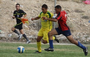 אור צוברי במאבק עם הישאם אלעתמין. שחקני שערים התקשו במחצית הראשונה (צילוםף אנס אבודעבס)