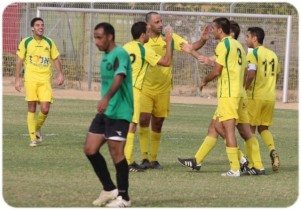 האשם אלקרנאווי(בירוק) מנסה לבלום את גיא חיה משעריים(צילום אנס אבודעבס)