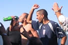 רפי בלו(לוגם שמפניה)ויחיאל זכריה חוגגים עלייה לליגה א.(צילום:רואי רון)