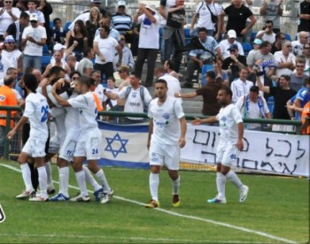 בחורים כובשים:החלוץ אבי מלכה (בכחול) כובש שער היתרון לאילת וסבג כובש השיויון ליפו (צילום יוסי דוס-סנטוס)