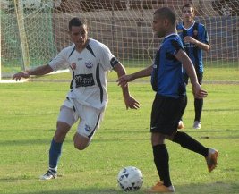 גיא כהן(בלבן)עם הכדור אחמד גליון כובש השער משקיף מאחור.