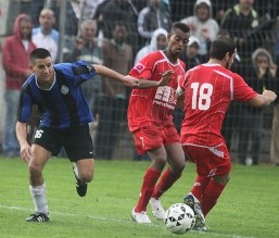 אספא (בכחול) נוגח את הכדור לעבר השער. (צילום: שלומי גבאי).