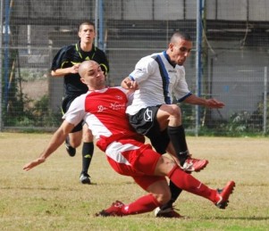 פתיחה הססנית. אבישי צגהון (באדום) בולם את אייל זדה (צילום: אמיר דבי)