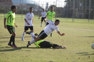 המשחק התאזן במחצית השנייה. אבי כהן מעל טל אברהמי (צילום: שלומי גבאי)