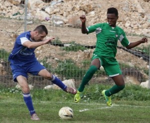 המשיכו להביך את הגנת נחלת. ליעד פרץ מנסה לעצור את הבעיטה של אלכמלאת (צילום: אנס אבודעבס)