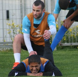 אדיר קרן מריץ את מוטיקו וג'ניה. אווירה טובה באימון (צילום: ארז נעמן)