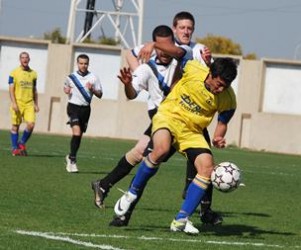 רצו להכריע את המשחק. משה עמר בועט לקורה (צילום: אמיר דבי)