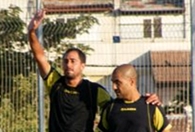 אורן גבאי(משמאל)ומושיקו אסולין חוגגים את אחד השערים מול הוד השרון.(צילום:דני מלניצקי)