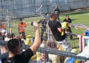 איך שנכנסתי חטפתי הלם. זה היה כמו כלוב בגן חיות. גדר שהוקמה השבוע חצצה בין שני חלקי היציע. אצלנו עוד היה מרווח בצד של יבנה היה צפוף. לא נראה כאילו שזה שינה להם כל כך. החגיגות היו בעיצומן. עשו רעש של 1,400. לפי כמות הנייר המגרסות ביבנה עבדו השבוע שעות נוספות.