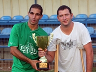 אלי אוחנה(מימין)וויליאם פאנוס חוגגים גביע הסטורי לגדנ"ע.(צילום:לירן דורף)
