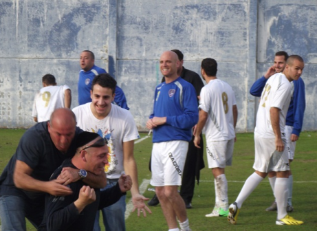 חולון נכנסה להלם. שחקני באר יעקב חוגגים (צילום: אלירן ברנשטיין)