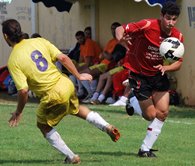 טפר(בצהוב)מכשיל את סרסור וגורם לפנדל.(צילום:אמיר דבי)