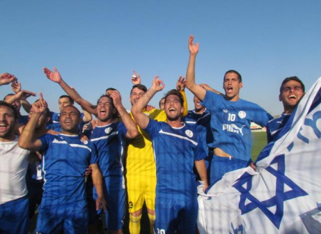 עברו לכדורים נייחים. השער והחגיגיה של סימן טוב והאוהדים (צילום: מוחמד חאדר אניס)
