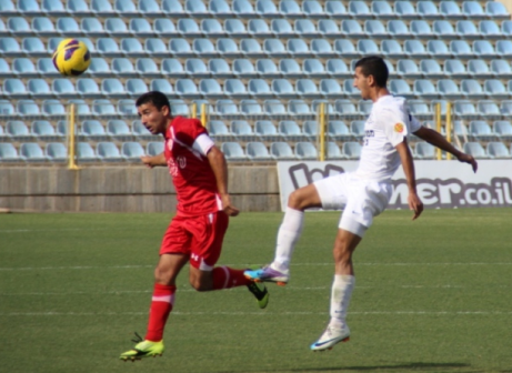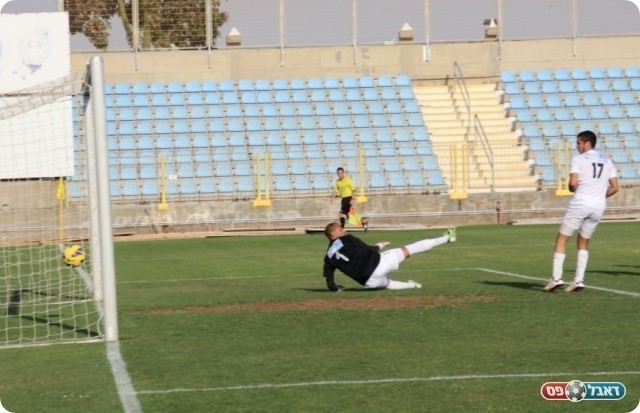 בדקה ה-35 קיבל אלון רבינוביץ' כדור במרכז המגרש, פרץ לעבר שער הרצליה שבדרך הוא גובר על מגן ומצליח להעביר לאביאל גבאי שניצב באגף שמאל. האחרון הקדים את מוחמד קאסם ומול קרטה שלח בעיטה לפינה הרחוקה של השוער, יקיר קרטה. אך זה הוכיח כמה היה חסר להרצליה כשהצליח בקצות האצבעות להרחיק לקרן.