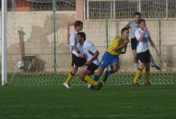 יוסי יונה מיבנה (בלבן) ועומר אבו הדובה מקריית גת . שני כובשי השערים היום במשחק (צילום:בועז רביד)