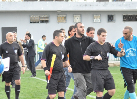 בדקה ה-75 של המשחק, במצב של 0:2 לאורחים ביקש השופט כארם עואד לשלוף לעזמי חטיב המקומי כרטיס צהוב שני. זה בתגובה איים על השופט שאם יעשה כן, יחטוף. השופט לא שעה לאיום ושלף לחטיב את הכרטיס. השחקן בתגובה חבט בשופט בעוצמה בפניו של השופט והפילו אל הדשא.