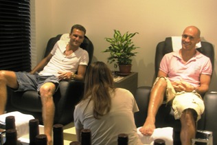 השניים שהגיעו בתום אימון בוקר מפרך נשכבו על מיטת הטיפולים והתפנקו להם בעיסוי, אוזן שמיהר לאסוף את בתו ליה, שילב עיסוי וטיפול פדיקור והבטיח לבוא פעם נוספת כשהוא אינו לחוץ בזמן.