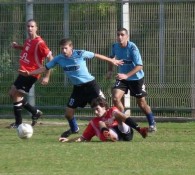 רועי אדרי (באדום) מבני יפו מדגים לשחקני הבקעה את שליטתו בכדור היום במשחק (צילום:בועז רביד)