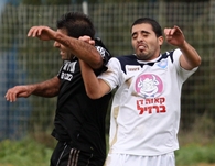 יוסי בן שמואל (בלבן) עוצר את אלי כהן מקריית גת.(צילום:אנס אבודעבס)
