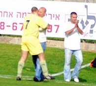 איציק זעפרני(במשבצות)מול מוטי שורש ממלאכי,נצחון חשוב לצהובים.(צילום:מאיר שילון,אתר אשקלונים)