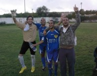 השוער טום קשתי (שני משמאל) עם שחקני הקבוצה ,חוגגים היום נצחון נוסף במגרש בחולון .