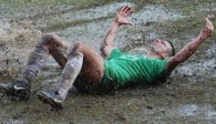 .שחקני מכבי דליאת אל כרמל חוגגים בבוץ לאחר שער הנצחון במשחק מול גבעת אולגה .