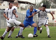 משה ג'רבי(בכחול)חומק מאודי לוטן המקומי,ג'רבי התקשה מאוד לבדו בחוד.(צילום:לירן דורף)