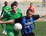 אלי דבש(בכחול)כובש את שער היתרון של באר שבע.(צילום:אנס אבודעבס)