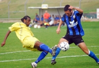 חנן אלקיים(בצהוב)מעביר עוד כדור ע"פ יוני קים ממבשרת.(צילום:מאיר שילון)