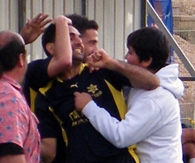 אסולין חוגג עם הספסל את השער הראשון של שעריים.(צילום:שמעון לוי)