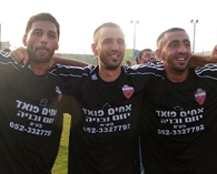משמאל לימין:יוסי ג'נח,אסף פחימה וכילאני מחאגנה חוגגים נצחון חשוב לג'ת אלאהלי.(צילום:אתר goool)