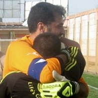 השוער חיים קאופמן מחבק את אפי אלון שמאחור המאמן המאושר ישראל צרפתי,נצחון חשוב לכפר סבא.(צילום:דני מלניצקי)