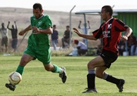 ישראל עמר (בירוק) ואמיר אלאפינש מפעילים מבערים במירוץ אחר הכדור.(צילום:אנס אבודעבס)