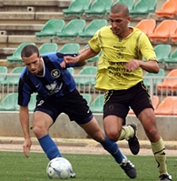 אלון אברמוביץ'(בכחול)שומר על הכדור מפני קובי דומר הכפר סבאי.(צילום:לירן דורף)