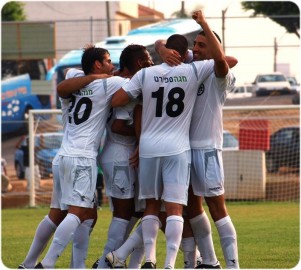 שחקני מכבי יבנה חוגגים את השער הראשון שהם כל כך ציפו לו (צילום:בועז רביד)