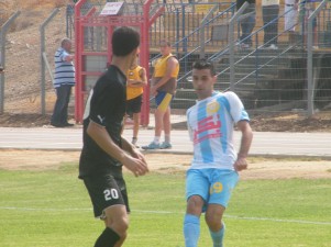 ראיד ג'ברין (בתכלת) מול אבי עמר. מחצית ראשונה חלשה (צילום: מוחמד חאדר אניס)