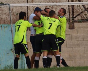 שני הכובשים של פתח תקווה רמי רוזוליו(משמאל)ואיל דואק(במרכז)בחיבוק משותף(צילום:בועז רביד)