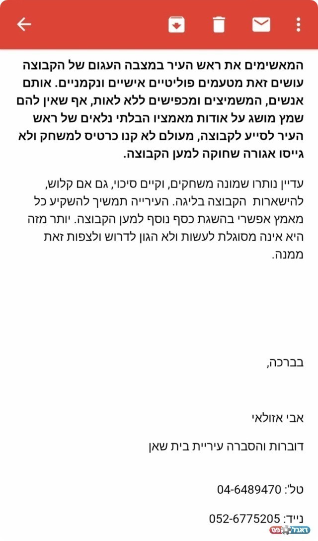 יש לך את החוצפה לבוא בטענות לאוהדים שמאשימים את ראש העיר? הרי מי אחראי לקריסת הקבוצה? מי מינה את ההנהלה? מי לא העביר את כל הכספים המובטחים לקבוצה? מי הבטיח שיסגור חשבונות עם הספקים ולא שילם?!