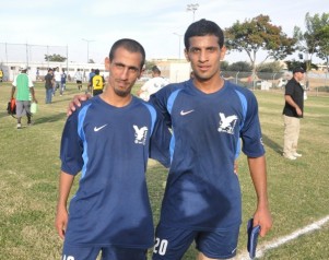 האשם אלעתמין (בכחול) מרהט ממתין רחבה לצידו של סדי בוהדנה משדרות (בצהוב), כמה דקות לפני שכבש את הראשון של רהט. שוער שדרות, גנאדי וולקוב משקיף מהצד (תצלום: אורי גבאי)
