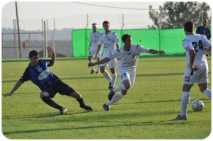 שגיא חייט עם הכדור מול גיא כהן מחדרה "השחקן הבולט ברמות מנשה "(צילום אביב תקשורת)