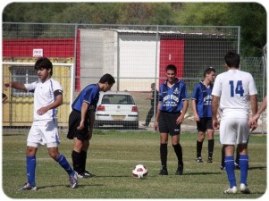אסף מלול ממגדל העמק (בכחול שחור) מתכונן לבעיטה חופשית. יניר לוי (מספר 14) משקיף (צילום: עמוס קלס)