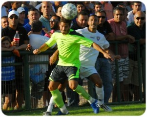 עידו אליהו הסקורר האילתי(בלבן) במאבק על הכדור עם אדיר קרן (צילום מאיר אוחיון)