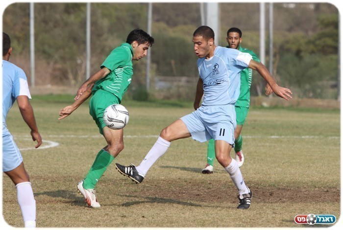 אביעד צוברי מול דניאל רז עמישב בדרך להשגת הכדור (צילום:ניר חורי)