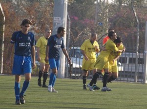 כן ..גם זאת דרך לעצור כדור מצד שחקני אליצור יהוד..לא שזה עזר (צילום: בועז רביד)