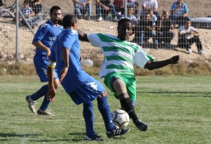 ליאור בננו (בכחול) וחילמי אלקמאלת במאבק אווירי. המקומיים קיבלו חיזוק מהאוהדים (צילום: אנס אבודעבס)
