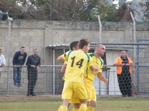 חגיגה מקורית. שחקני שעריים חוגגים את היתרון של ירימי (צילום: שמעון לוי)