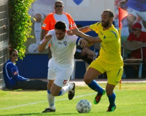 חלוץ אילת אבי מלכה חולף על פני בלם השקמה רועי אליהו (צילום :מאיר אוחיון)